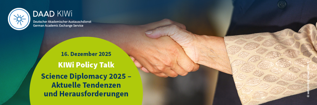 Im Rahmen der Veranstaltung KIWi Policy Talk | Wissenschaft und Politik im Dialog Science Diplomacy 2025 – Aktuelle Tendenzen und Herausforderungen werden Foto- und Videoaufnahmen gemacht, die zur Dokumentation und für die Öffentlichkeitsarbeit des DAAD-Kompetenzzentrums Internationale Wissenschaftskooperationen (KIWi) als Veranstalter verwendet werden. Die Auswahl der Fotos erfolgt nach einer sorgfältigen Abwägung zwischen den Persönlichkeitsrechten der Betroffenen und den Interessen des KIWi. Sofern Teilnehmende auf Aufnahmen zu sehen sind, achten wir insbesondere darauf, dass diese nur am Rande oder als Teil einer Gruppe gezeigt werden und dass keine Einzelpersonen ohne deren vorherige Einwilligung im Vordergrund stehen. Diese Aufnahmen können in verschiedenen Medien, einschließlich unserer Website, sozialen Netzwerken und Printpublikationen, veröffentlicht werden. Die Aufnahmen werden auf Grundlage unseres berechtigten Interesses gemäß Art. 6 Abs. 1 lit. f DSGVO erstellt. Sollten Sie nicht auf solchen Aufnahmen erscheinen wollen, informieren Sie uns bitte im Vorfeld unter kiwi-events@daad.de oder direkt bei der Veranstaltung. Weitere Informationen zur Verarbeitung Ihrer personenbezogenen Daten finden Sie in unseren ausführlichen Datenschutzhinweisen.